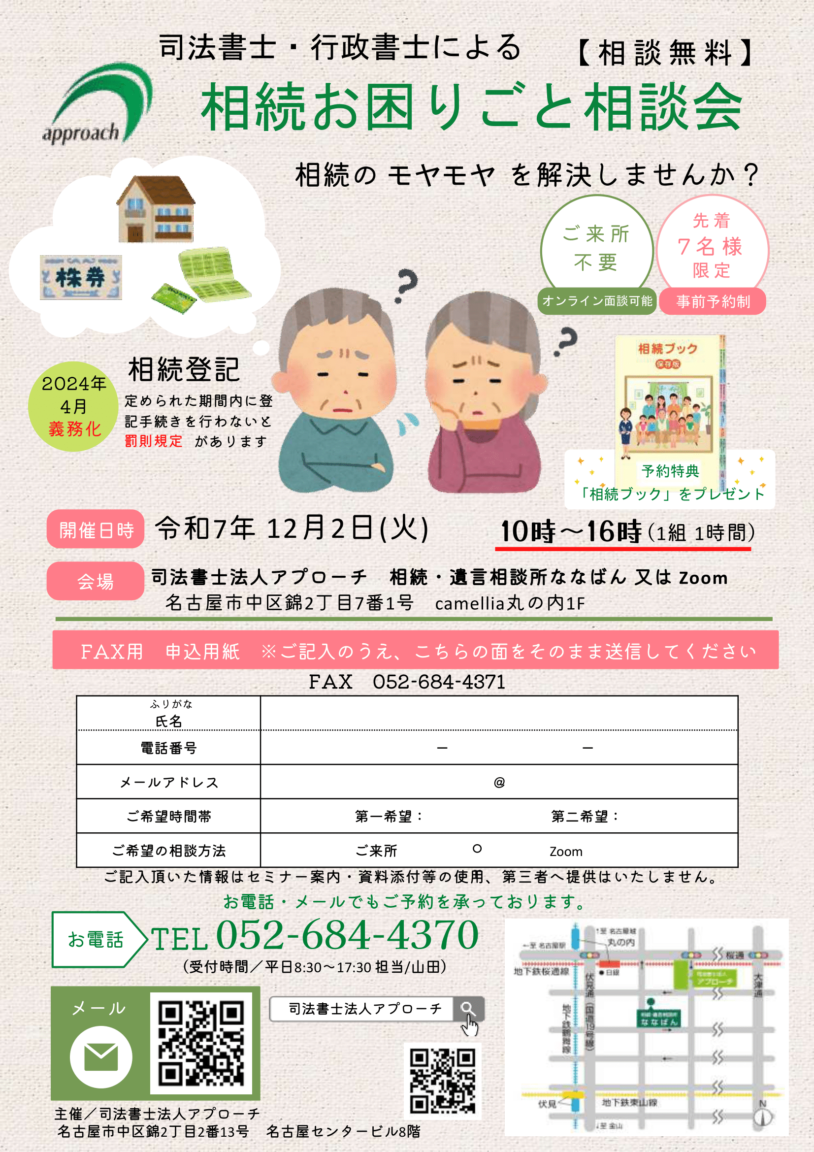 2025/11/20第36回 相続お困りごと相談会を下記日程で開催致します。