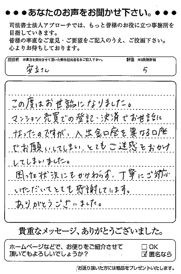 この度はお世話になりました。 マンション売買での登記・決済でお世話になったのですが、入出金口座を異なる口座でお願いしてしまい、とてもご迷惑をおかけしてしまいました。 困った状況にもかかわらず、丁寧にご対応いただいてとても感謝しています。 ありがとうございました。
